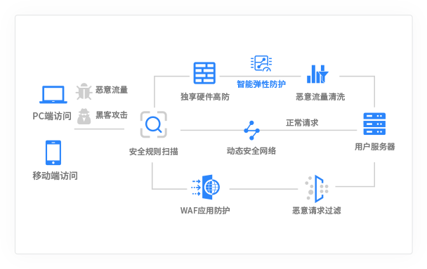 Anti-DDoS 系统全天候监控网络流量,精准识别 DDoS/CC 全类攻击并秒级触发防御。 -